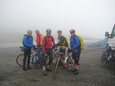 Der Anstieg war absolut gleichmäßig und gut zu fahren und eigentlich ein riesiger Wiesenbuckel, und doch sah keiner von uns irgendetwas. Wir fuhren in den Wolken, und immer stärker fing es an, aus diesen zu tropfen. Vor uns waren Opfer! Die spanische Gruppe aus unserem Hotel. Sie hatten heute den gleichen Weg, doch sie fuhren ohne Rucksack und mit Begleitbus, welchen wir später noch schätzen lernen sollten. Oben am Pass angekommen, wollten wir uns schnell anziehen und den unwirtlichen Ort verlassen, doch nun öffnete der Himmel seine Schleusen und es goss in Strömen. Die Spanier riefen, und wir durften mit in den großen Bus, um mit ca. 20 spanischen Radfahrern den Regen auszusitzen. Wir bekamen zu trinken und konnten uns im Trockenen umziehen. Es dauerte nicht lange und wir waren aufgedresst mit allem, was der Rucksack hergab, und los ging’s.
